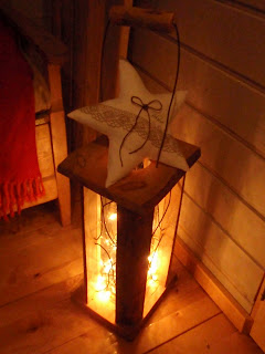 Toinen tyynyistä pääsi ison tallilyhdyn päälle, jonka sisällä on jouluvalot. Lyhdyn olen ostanut pari-kolme vuotta sitten messuilta ja selvästi suosikkilyhtyni, jonka kaivelen ensimmäisenä syksyllä esille! Antaa ihanan tunnelman ympärilleen!